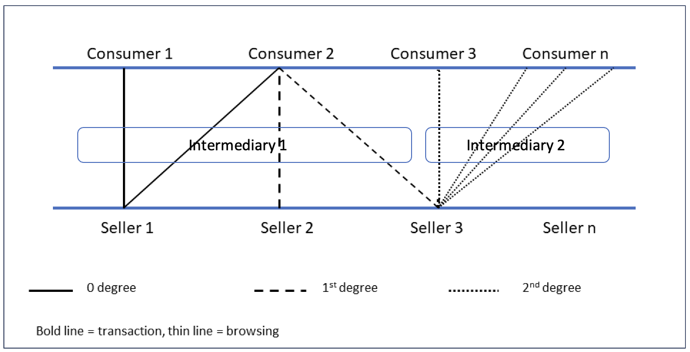 Figure 1: Degrees of interaction, starting from a 0-degree direct link between Seller 1 and Consumer 1
