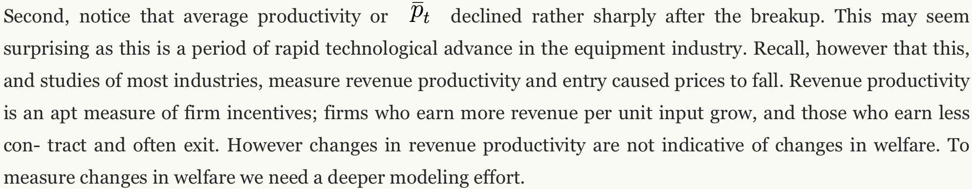 My first example is taken from Olley and Pakes (1995) who study the evolution of revenue productivity in the telecommunication industry after the breakup of A.T.& T. By revenue productivity I mean price times quantity (or sales) divided by an index of inputs. They show how to estimate a revenue production function from the plant level panel data at the U.S. census bureau, and use it to form the index of inputs needed for the productivity measure.